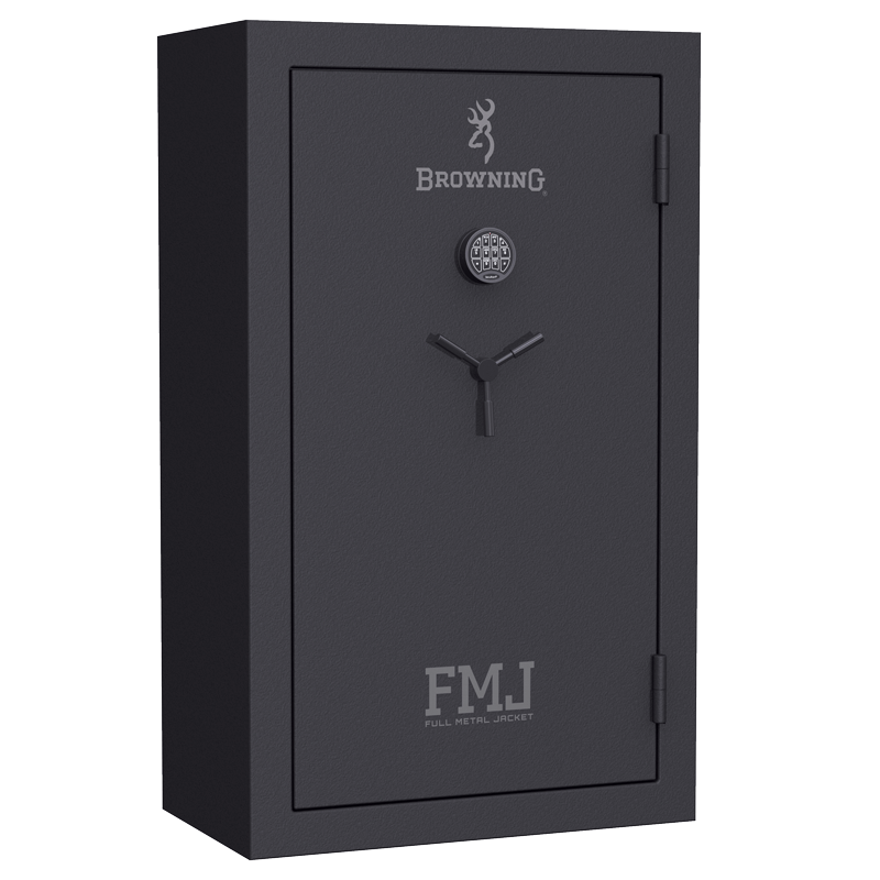 Charcoal Textured Finish: The outside is painted a charcoal textured finish with a professional, modern appearance and the distinctive FMJ Full Metal Jacket branding on the door. Black hardware including the lock, handle, and Browning logo create a cohesive, tactical aesthetic.