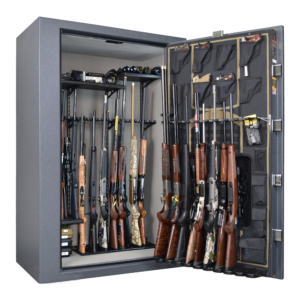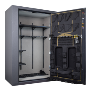 This 49-gun safe delivers premium security features in 66″H x 43″W x 25″D configuration with exclusive ThermaBlock fire protection.