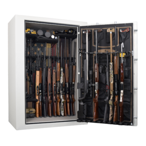 The Hunter 49T Patriot Edition delivers American-made security with patriotic styling, measuring 72″H x 42″W x 24.5″D exterior with tall interior accommodating firearms. The full DPX system maximizes organization while Quick Access Barrel Rack enables rapid firearm selection.