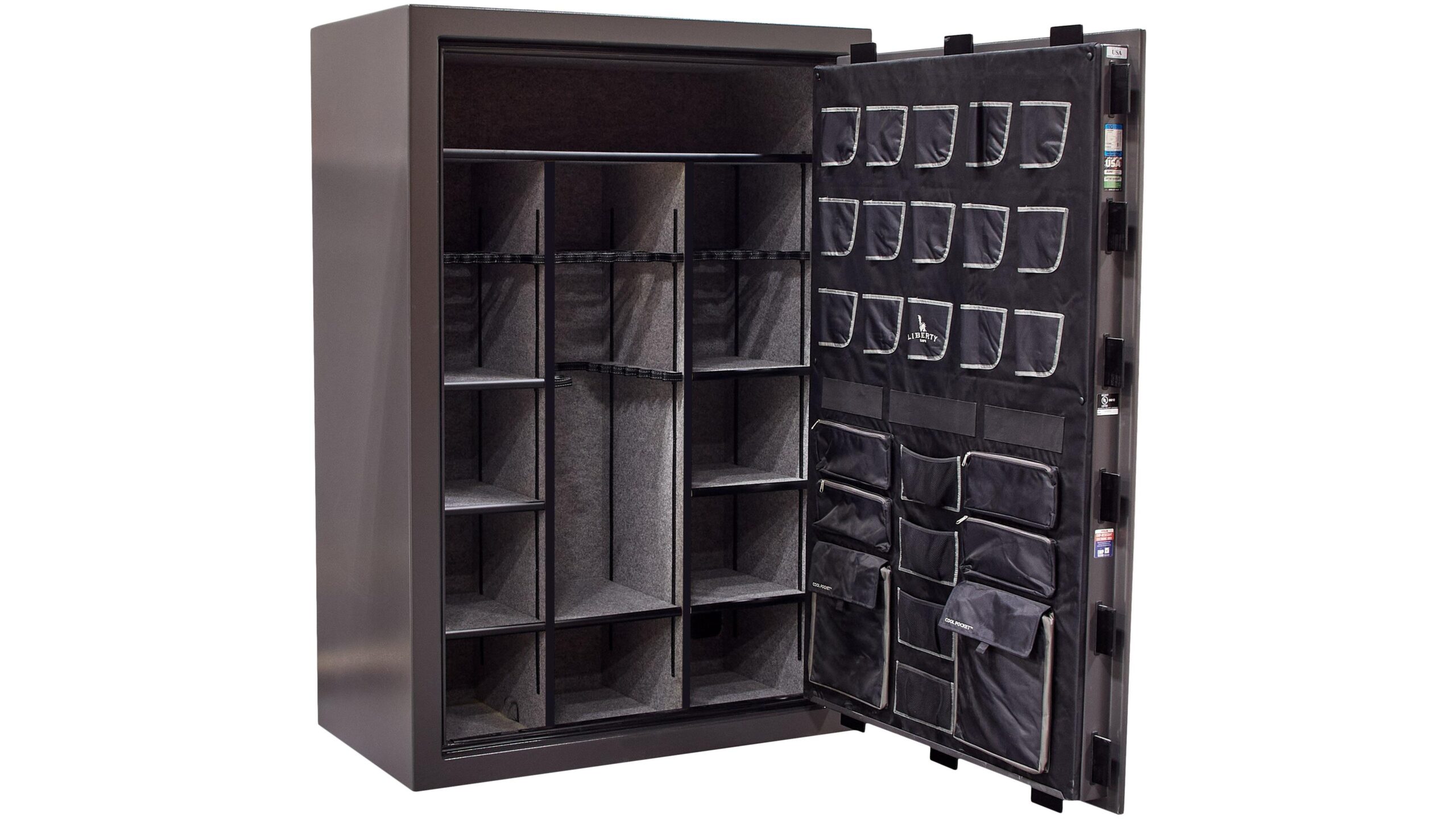 This 72-gun premium safe delivers commanding protection in extra-tall, extra-wide 72″H x 50″W x 27.5″D configuration weighing 1,230 pounds with Liberty’s largest door ensuring easy access and reinforced frame delivering top-notch pry resistance.
