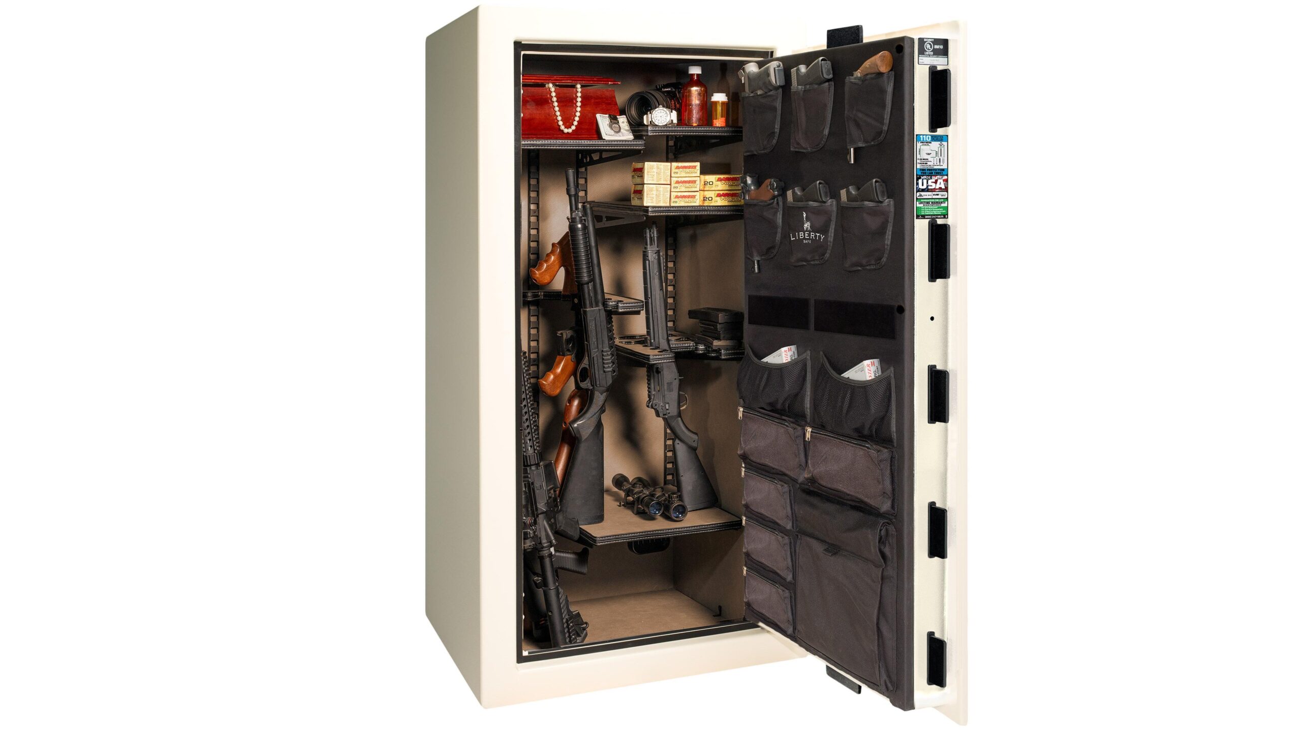 Factory-installed deluxe door storage panel provides padded storage for handguns, ammunition, magazines, and documents maximizing efficiency. Deluxe electrical outlet kit powers dehumidifiers and ClearView lighting system (installation required) protecting firearms from rust in humid Texas climates.