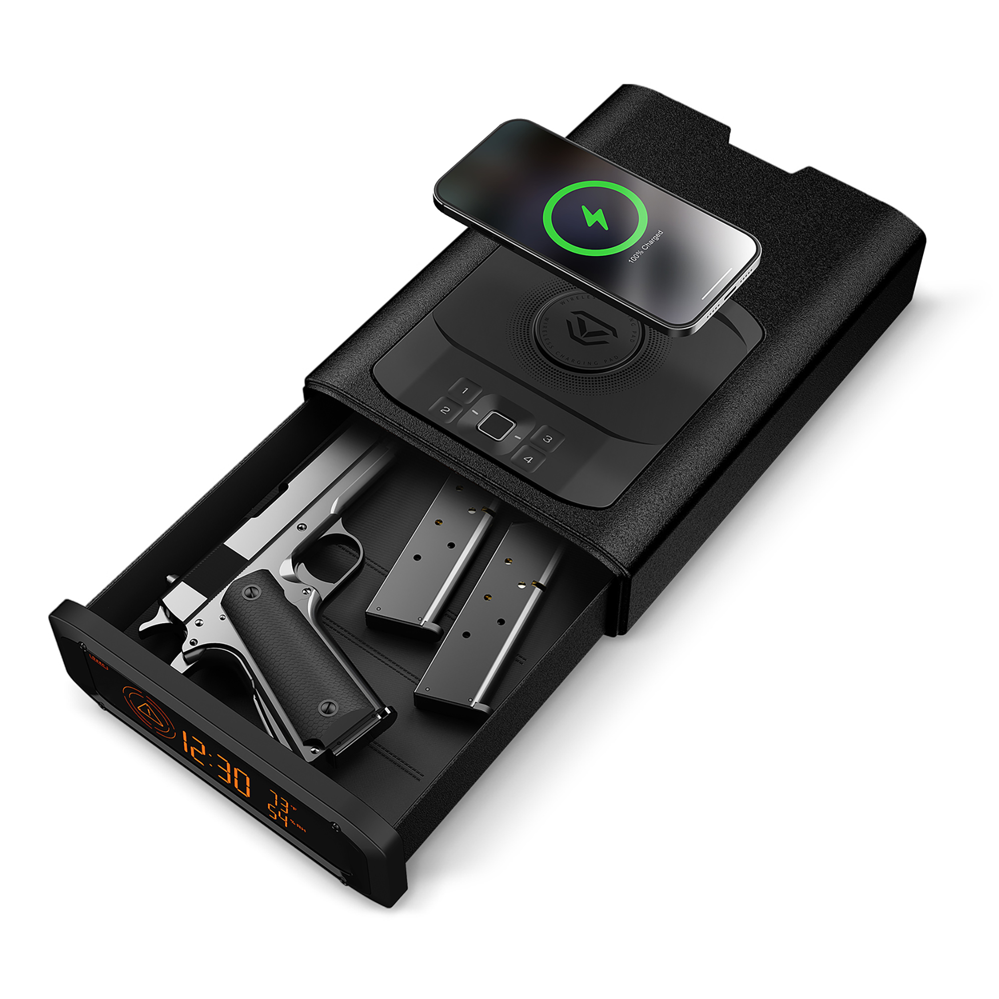 Experience the future of firearm security with the Vaultek DS2i Smart Station, the most advanced biometric gun safe available to Texas gun owners in Austin, San Antonio, Dallas, Houston, and surrounding communities. This next-generation smart safe combines lightning-fast biometric access, wireless device charging capabilities, and intelligent Bluetooth connectivity in a sleek, modern design that seamlessly integrates into any Texas home or office environment.