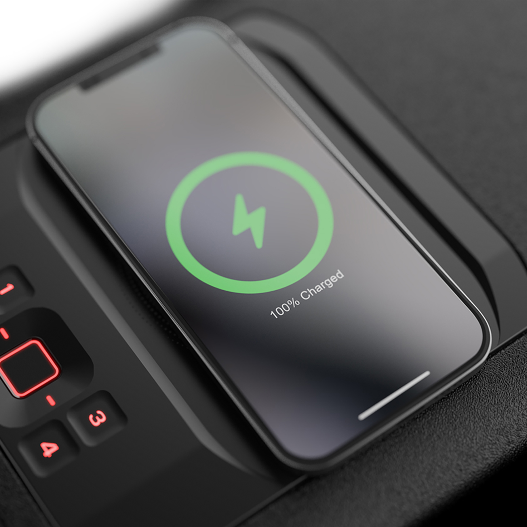 The DS2i Smart Station redefines quick-access gun storage with its comprehensive suite of modern features. The top-mounted wireless charging pad keeps your smartphone powered and ready, while USB and USB-C accessory ports provide convenient charging for additional devices. The customizable LED touch display shows time, temperature, and humidity, making this the ultimate modern home safe for tech-savvy Texas gun owners.