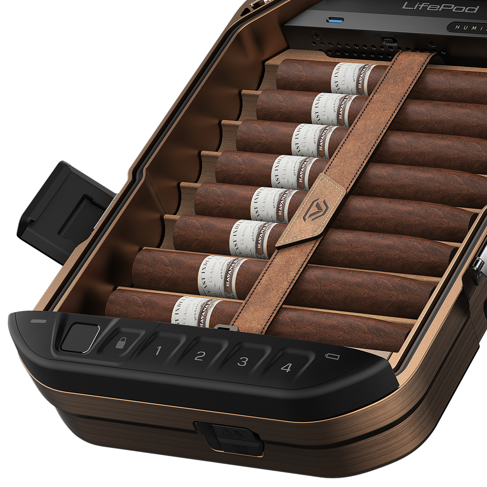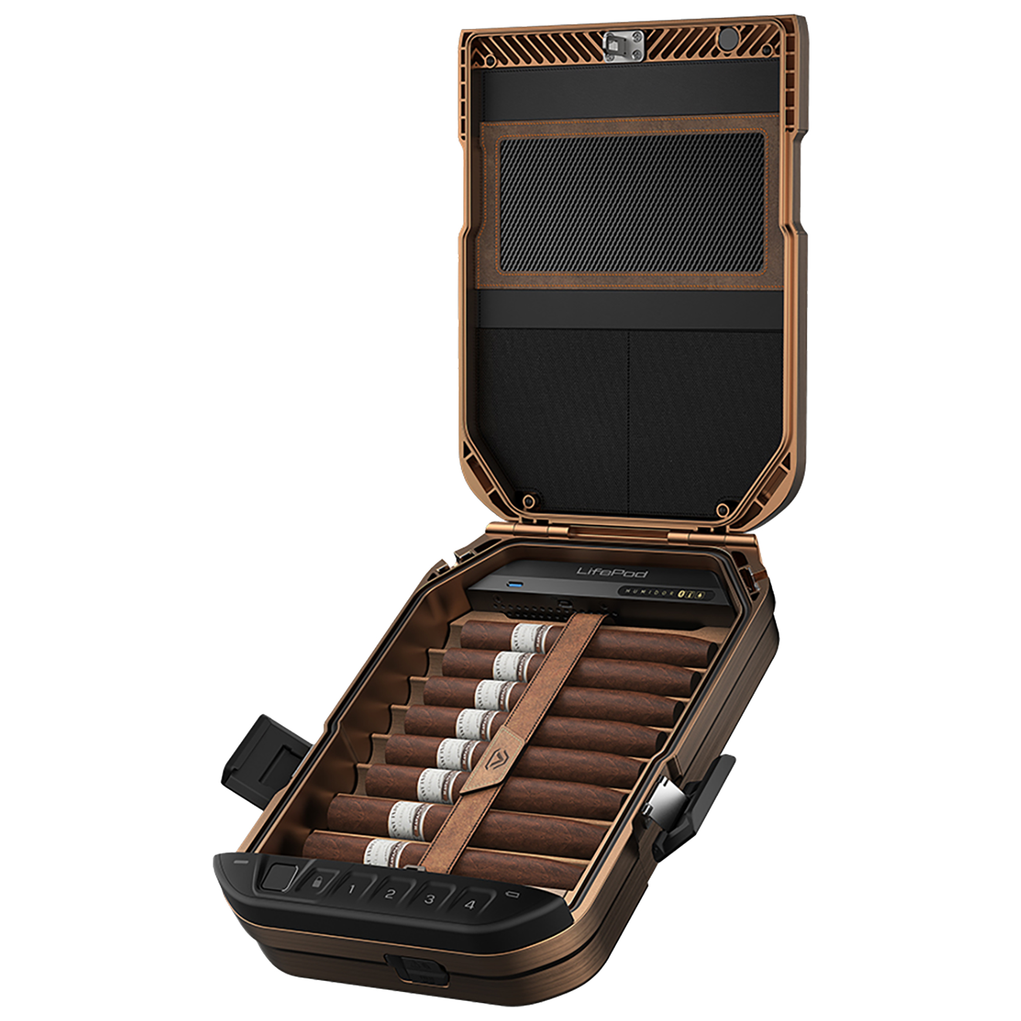 Advanced non-metal polymer construction provides lightweight portability with superior strength, drop-tested to protect cigars and internal monitoring electronics.